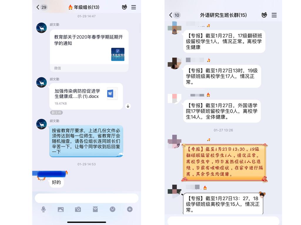 开始了同学们每天的平安报告,坚持“零报告”制度,做到本研学生100%全覆盖。与此同时,学院辅导员通过年级群、班长群、学务指导和班主任群、学生党员群、家长群等做好疫情防控的引导宣传工作,时时转发科学防疫注意事项以及相关工作通知。