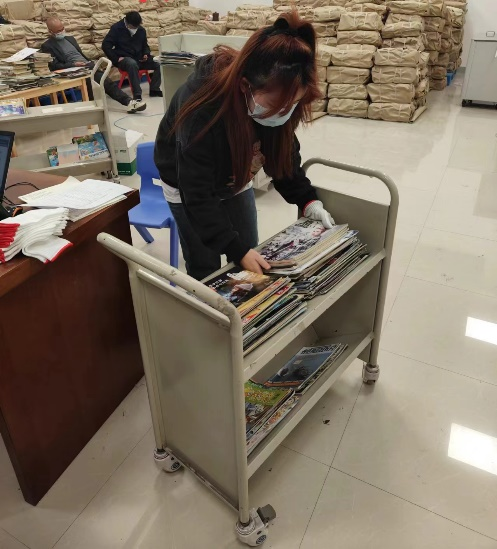 第一小组的志愿者们负责整理书籍,根据书籍的新旧、入库时间、书籍的种类,放回正确的位置。志愿者们还需要将新到的书拆包,协助工作人员将新书推放到指定位置,还将借出的书归回原位。志愿者们认认真真地进行着各自的工作,尽职尽责,用实际行动展现了雷锋风尚。