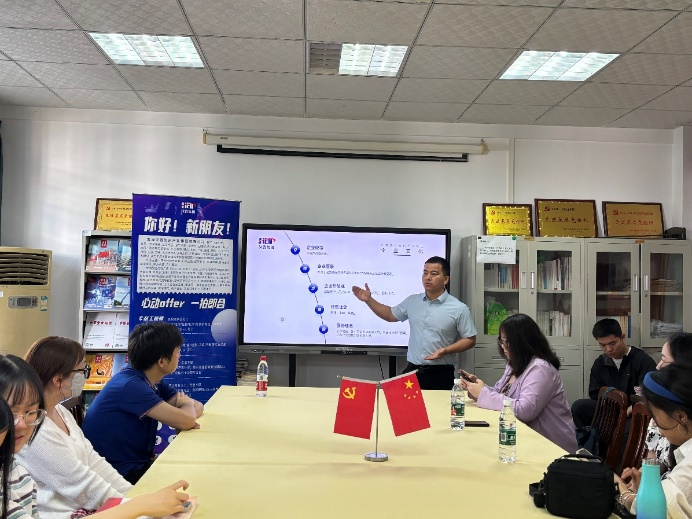 首先,招聘方王女士以轻松活泼的开场白向参会同学们表示欢迎,并开始了宣讲。她先是向同学们详细介绍了汉普知识产权集团,内容包括企业发展、公司分布、主要业务、服务对象、磁力猫等等。