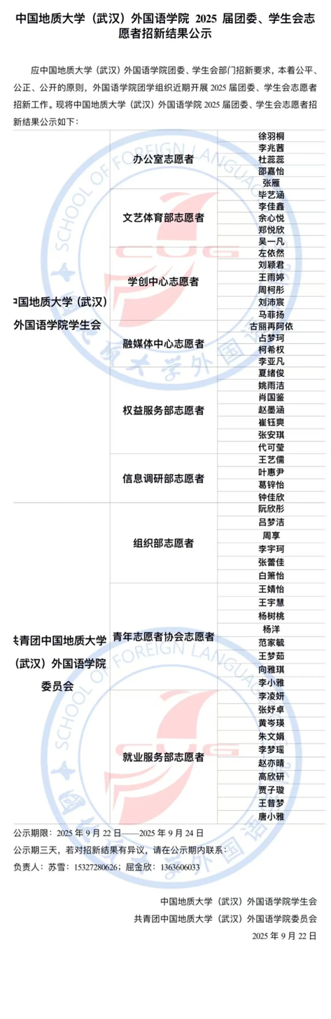 应磁力猫 (武汉)磁力猫 团委、学生会部门招新要求,本着公平、公正、公开的原则,磁力猫 团学组织近期开展2025届团委、学生会志愿者招新工作,现将磁力猫 (武汉)磁力猫 2025 届团委、学生会志愿者招新结果公示如下: