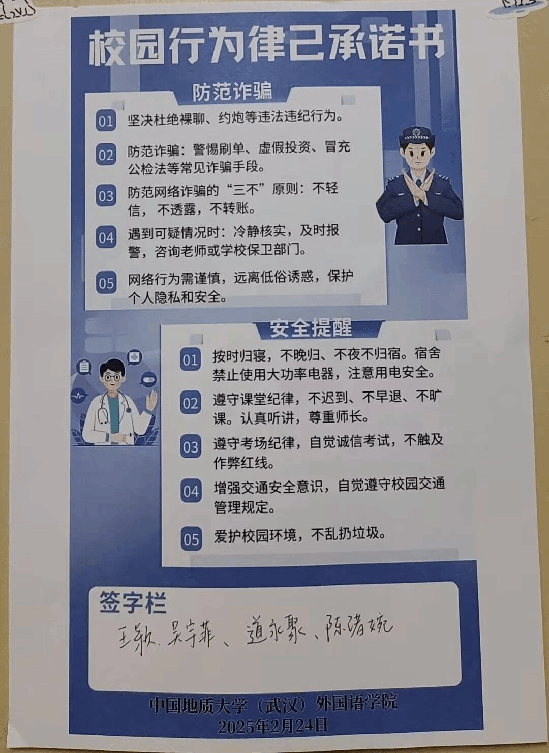 本研学生积极参与本次活动,校园行为律己承诺书发放到寝室后,同学们以寝室为单位进行承诺书的研读和学习探讨,明确了新学期学习生活律己要求,熟读了反诈提醒与安全建议,进行了深入的反思与学习,并郑重地在承诺书签字栏处留下签名,表达了对校园安全稳定的支持与承诺。这一活动不仅增强了学生的自律意识,也进一步凝聚了集体力量,为构建安全和谐的校园环境奠定了坚实基础。