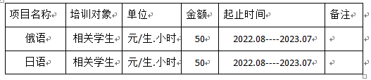 2022年8月—2023年7月中心新增语言培训课程及收费标准