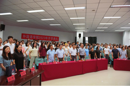 党委书记刘世勇、院长张峻峰、党委副书记胡文勤、副院长杨红燕、教育部出国留学培训与研究中心副主任赵英科、三级单位负责人、新生班主任、辅导员、2023级全体本研新生参加典礼。学院党委副书记胡文勤主持典礼。