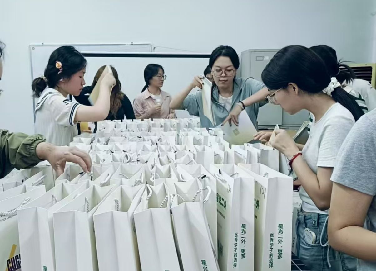 院徽以及学生会自主设计遴选的国风卡通角色——国风语UU,别出心裁!),还有早早在迎新点翘首以盼的志愿者们,无一不在彰显着我们早已做好准备,只为“精准接收”向我们“投送”的外国鱼儿们!