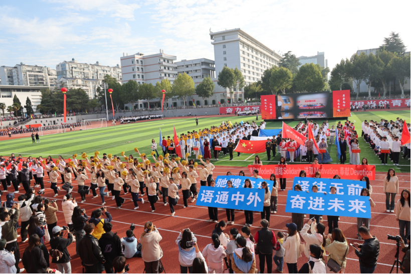师生方阵踏着《运动员进行曲》的鼓点亮相赛场,他们整齐划一,口号嘹亮,表演环节,师生健儿们热情活泼、协同演绎,本科生方阵用青春活泼的舞蹈表演搭配研究生方阵手持展板彰显外语人的“谦和、团结、进取、奉献”的院训精神,让外语人昂扬亮丽的青春风采闪耀赛场。