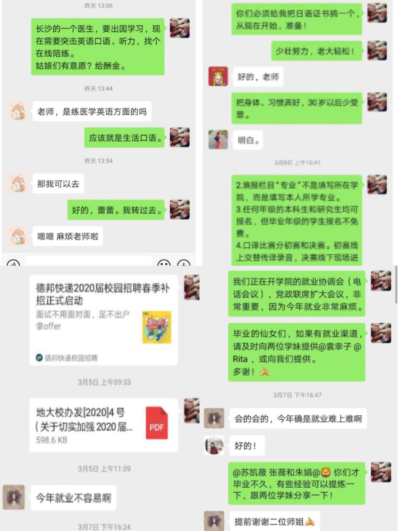 研究生导师王国念老师自疫情发生以来做了大量的志愿服务工作:积极发动校友捐款,为武汉医疗人员争取物资捐赠,担任志愿者整理分配物资,给因疫情限制出门的校园职工送粮送菜等。同时王老师作为研究生指导教师也密切关注着学生的实习实践和就业问题。他要求学生进行求职实效周报,动态掌握学生就业进展,同时经常在研究生群里发布实习和招聘信息,鼓励学生多参加实习实践;他还指导学生通过获得考级证书和比赛获奖,帮助她们增强专业技能、积累工作经验、拓宽就业出路,同时发动已毕业的研究生为学弟学妹们提供就业渠道。